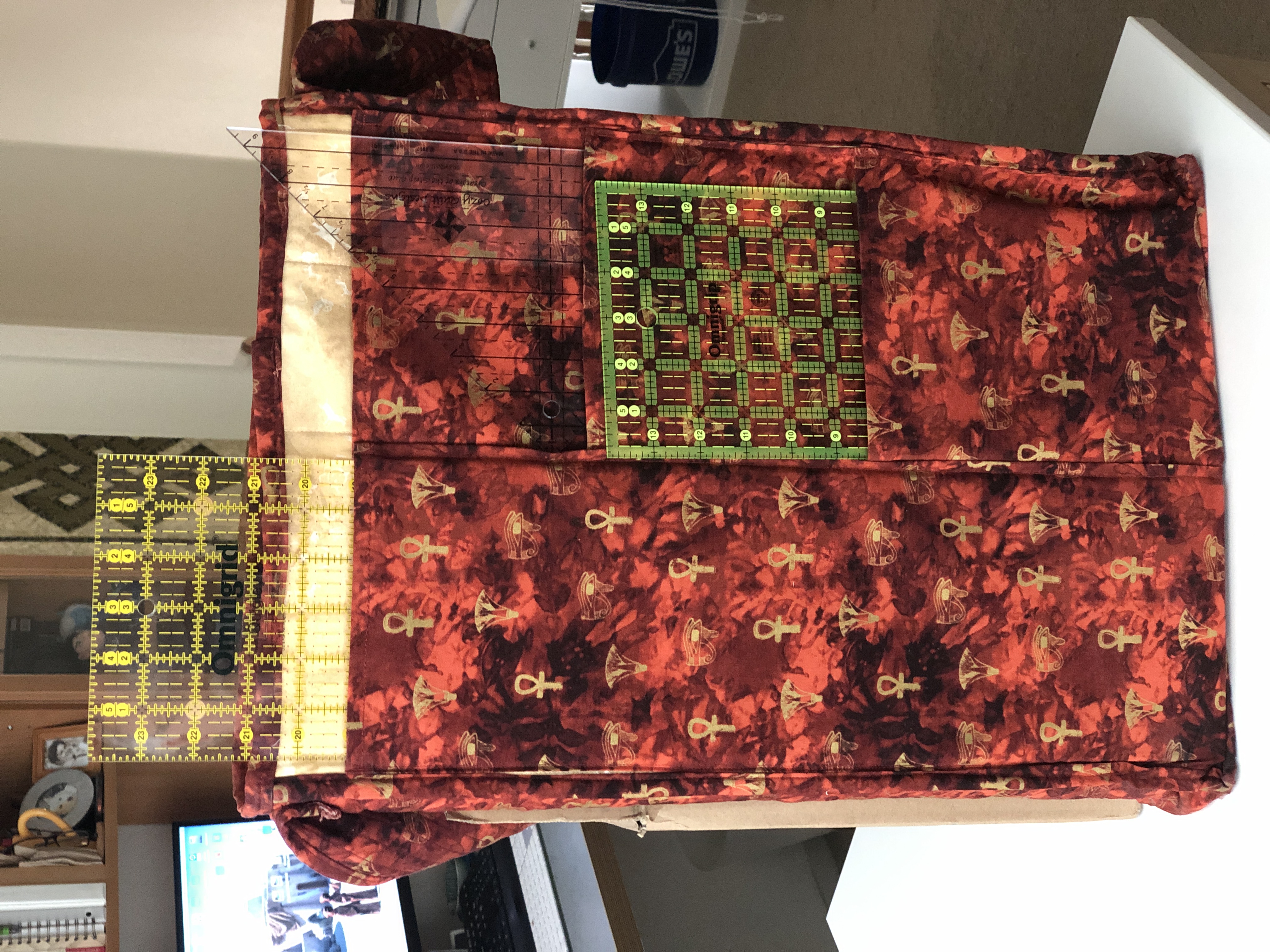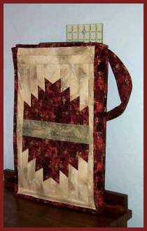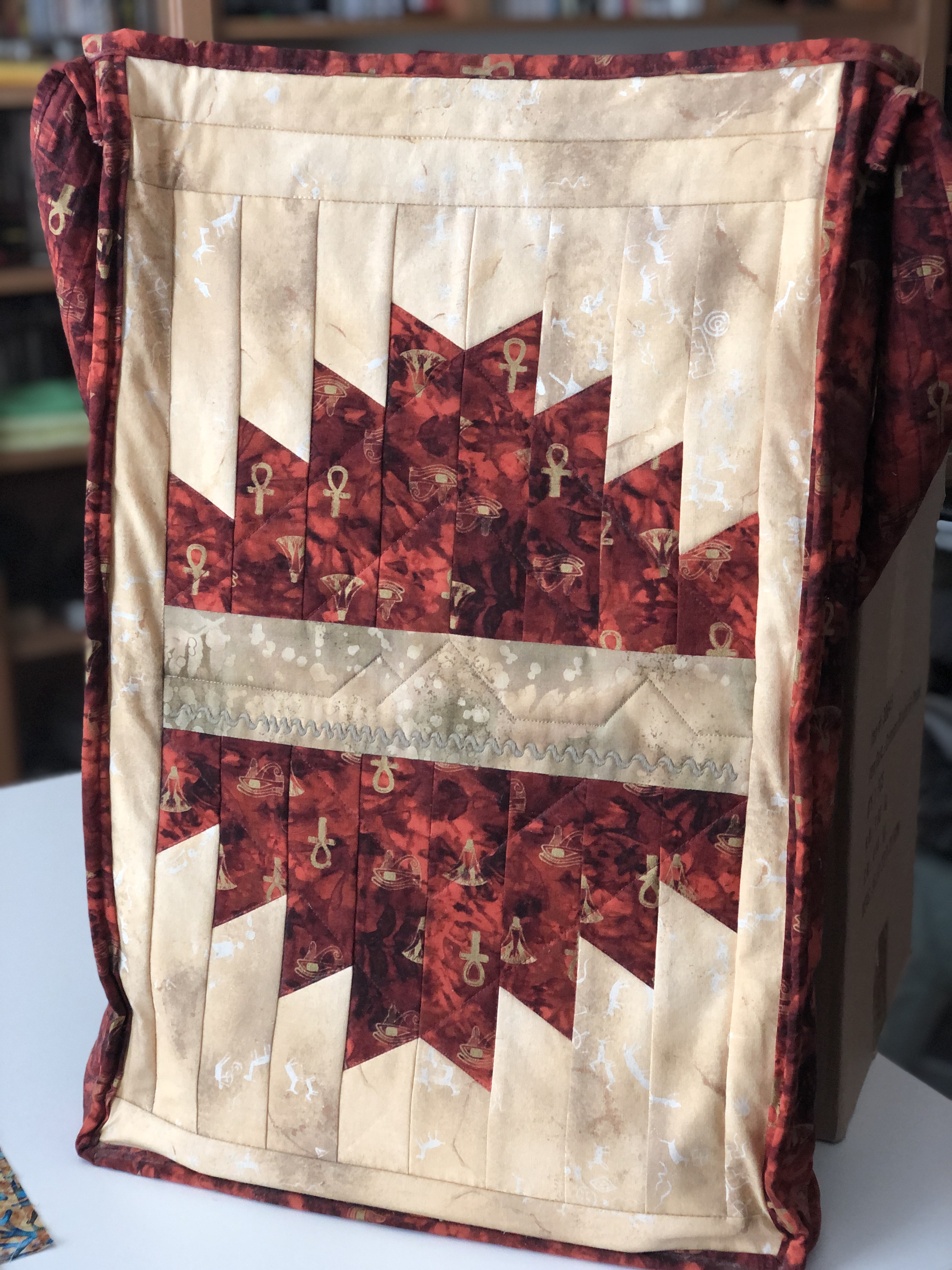 Early on in my career I created this quilting class tote bag - sufficient to carry my rulers, portable cutting mats and my traveling pressing mat. I love how this turned out. I used a few Delectable Mountains blocks with some really cool ancient Egyptian fabric. Just to try out some of my embroidery stitches on my old Bernina, I top stitched a to-scale image of the Pyramids of Giza. One of my favorite fabric projects.