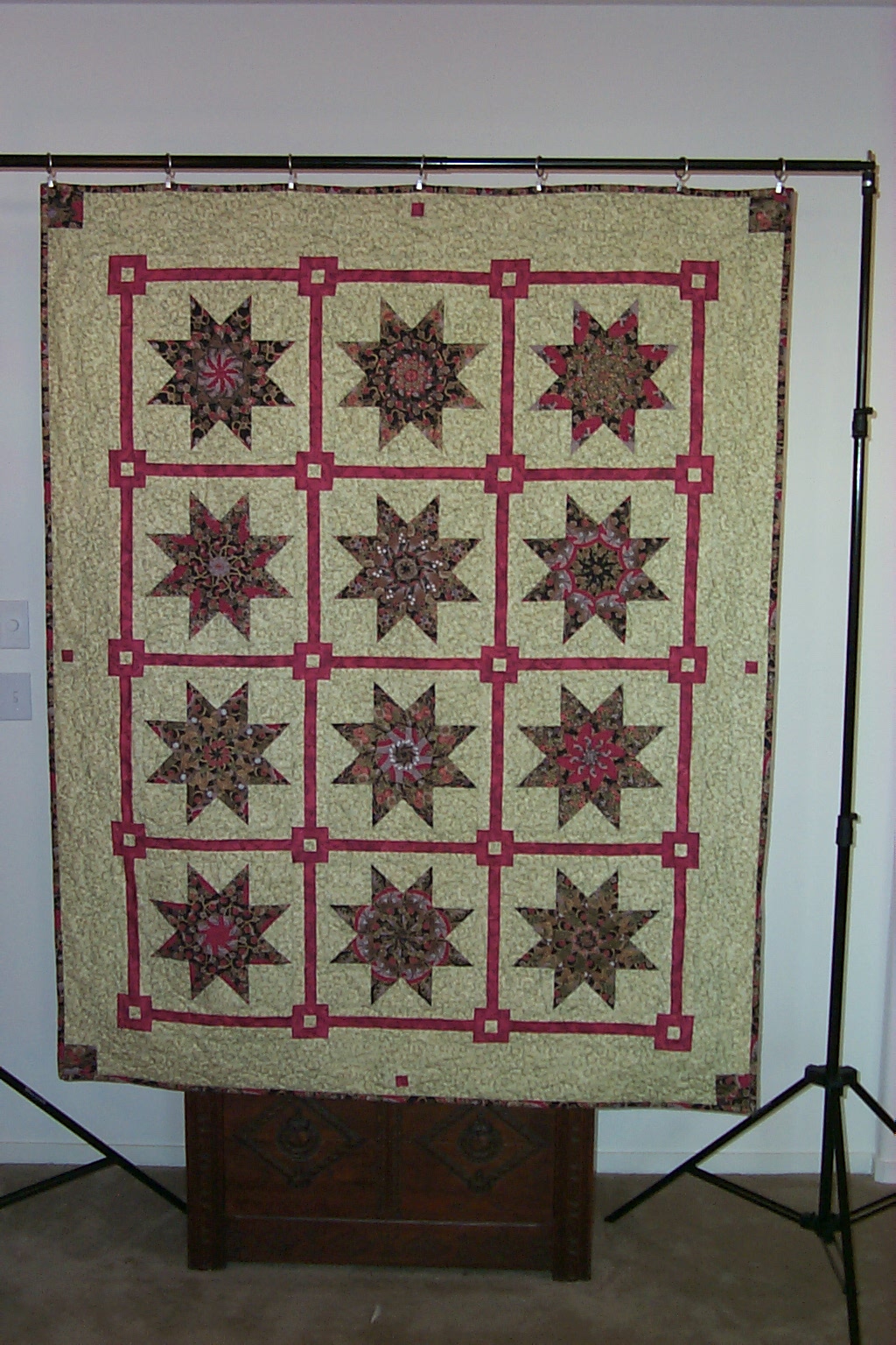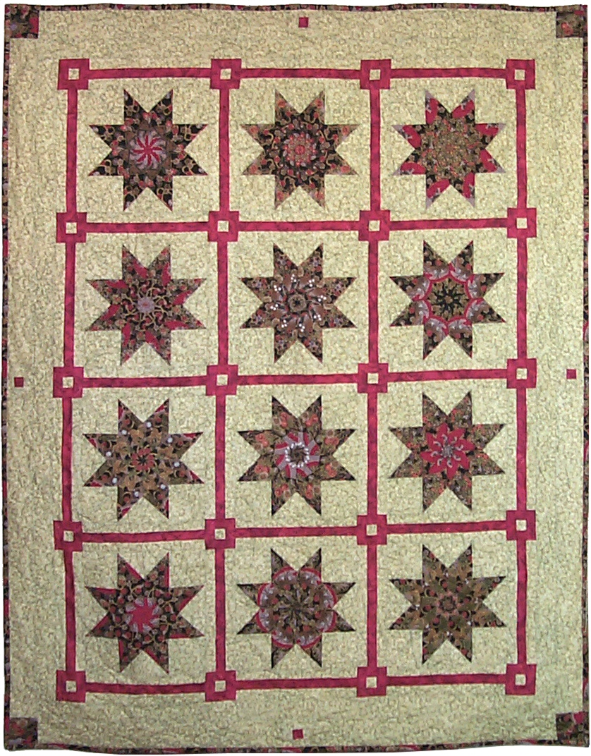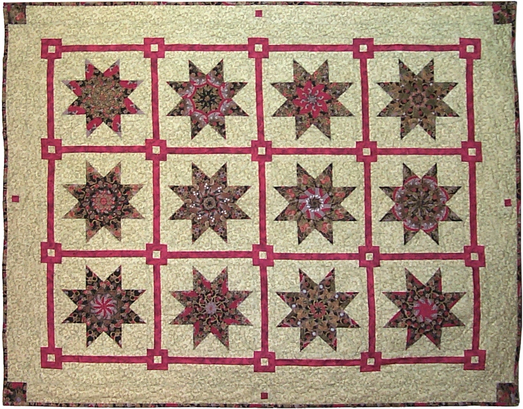 This quilt was my second Stack-n-Whack quilt I made for Tom's mother, Roseanne Adaline Mitchell. I chose fabrics that seem to go well with her decor. I believe she really loved this quilt. After her passing (RIP Roseanne), we gave this quilt to Tom's sister, Uriela. She is the perfect guardian for continuing this memory.