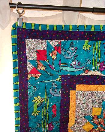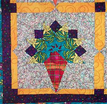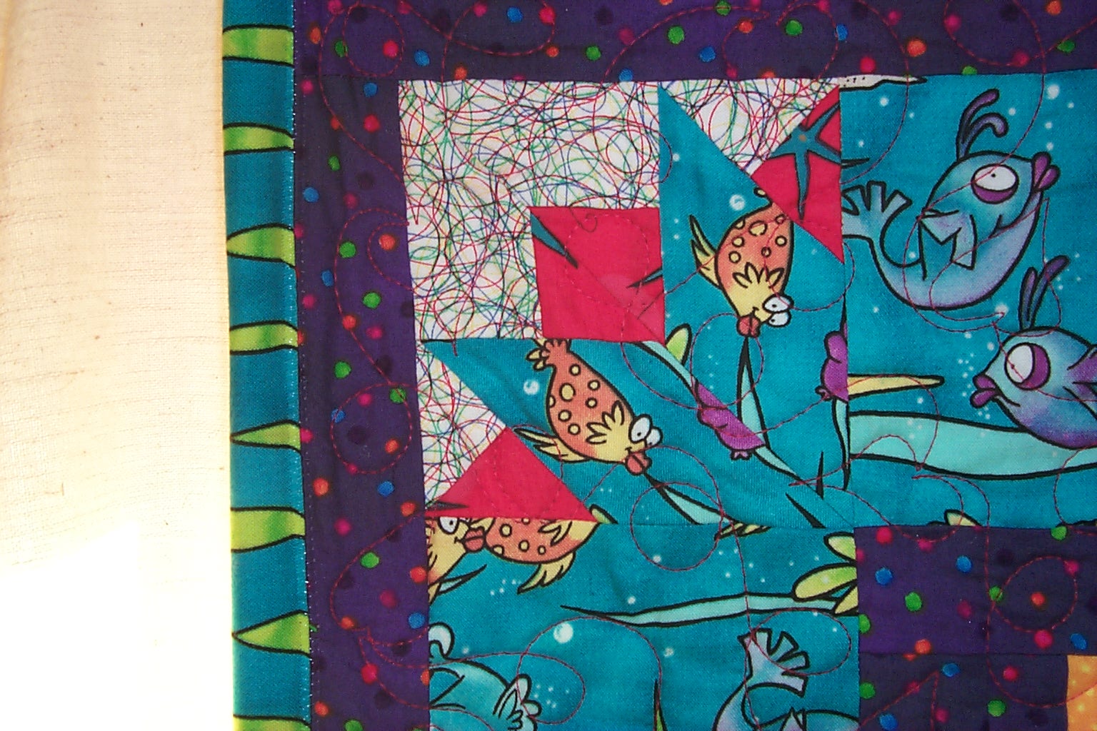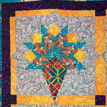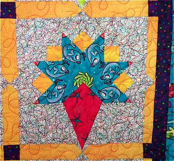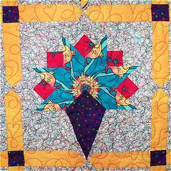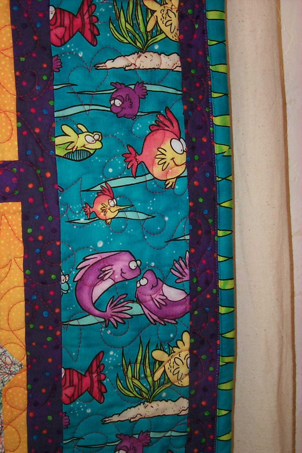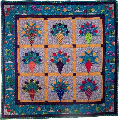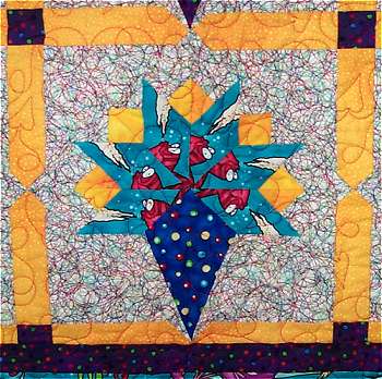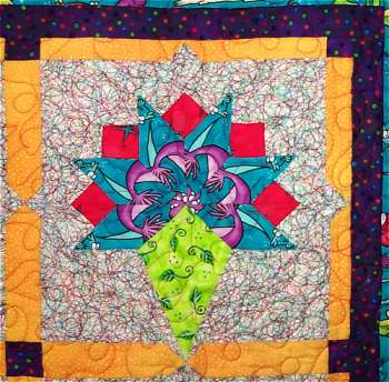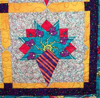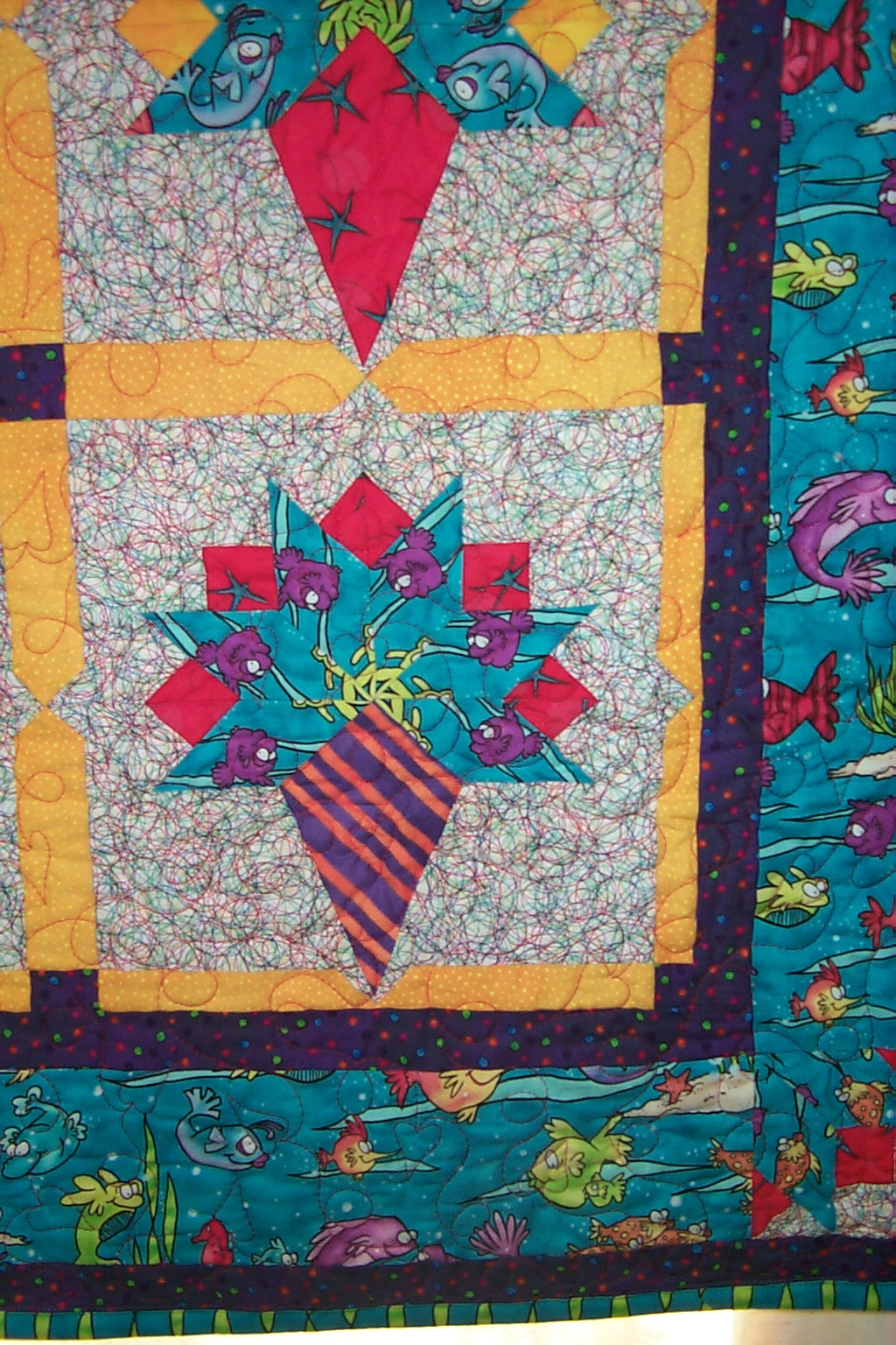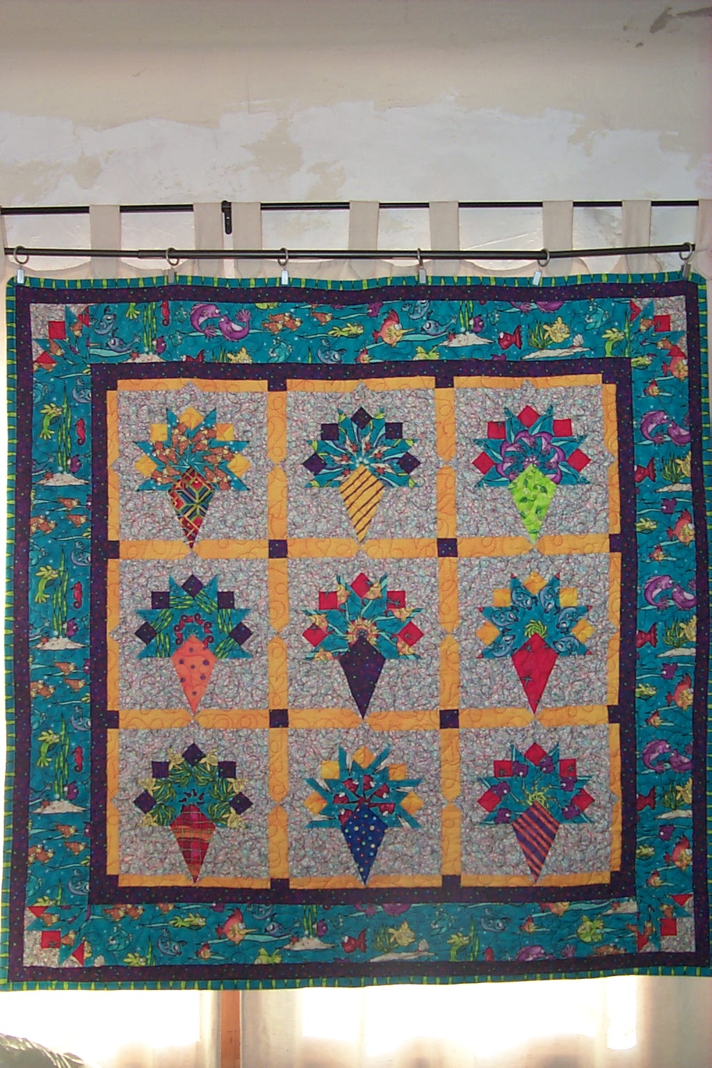 Very fun kids quilt made for Toms grandniece, Felicity. She too is all grown up now. This was my third Stack-n-Whack using a nosegay block for inspiration. The Dr. Suess-like fabric is among my favorite although I have no more in my stash. Sigh. Why is it so difficult for fabric companies to bring back fabrics from long ago? LOL.
